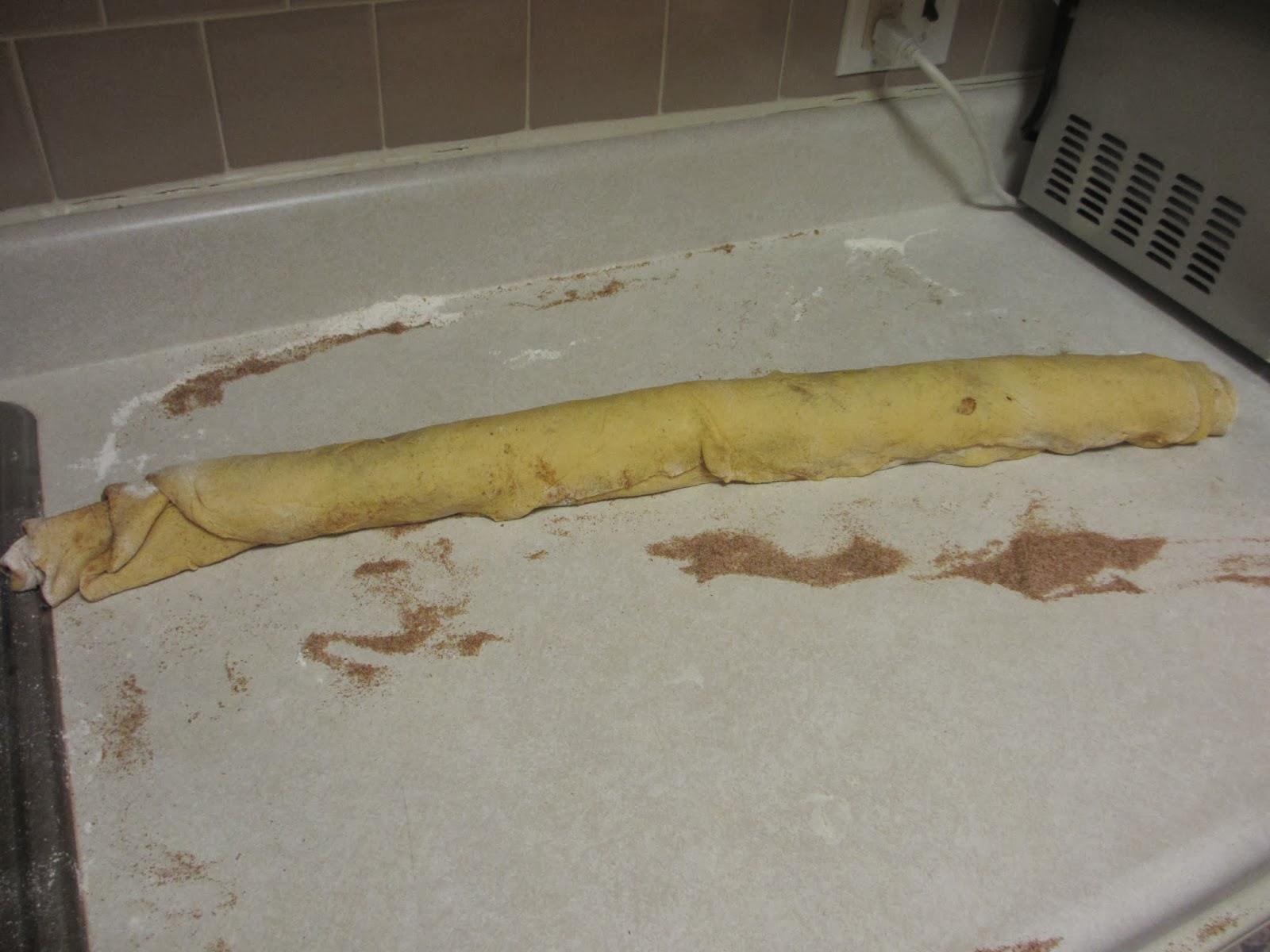 When doubled in size, punch down dough. Roll out on floured surface into a 15 by 9-inch rectangle. (note: I rolled mine too big, which I do not recommend.)